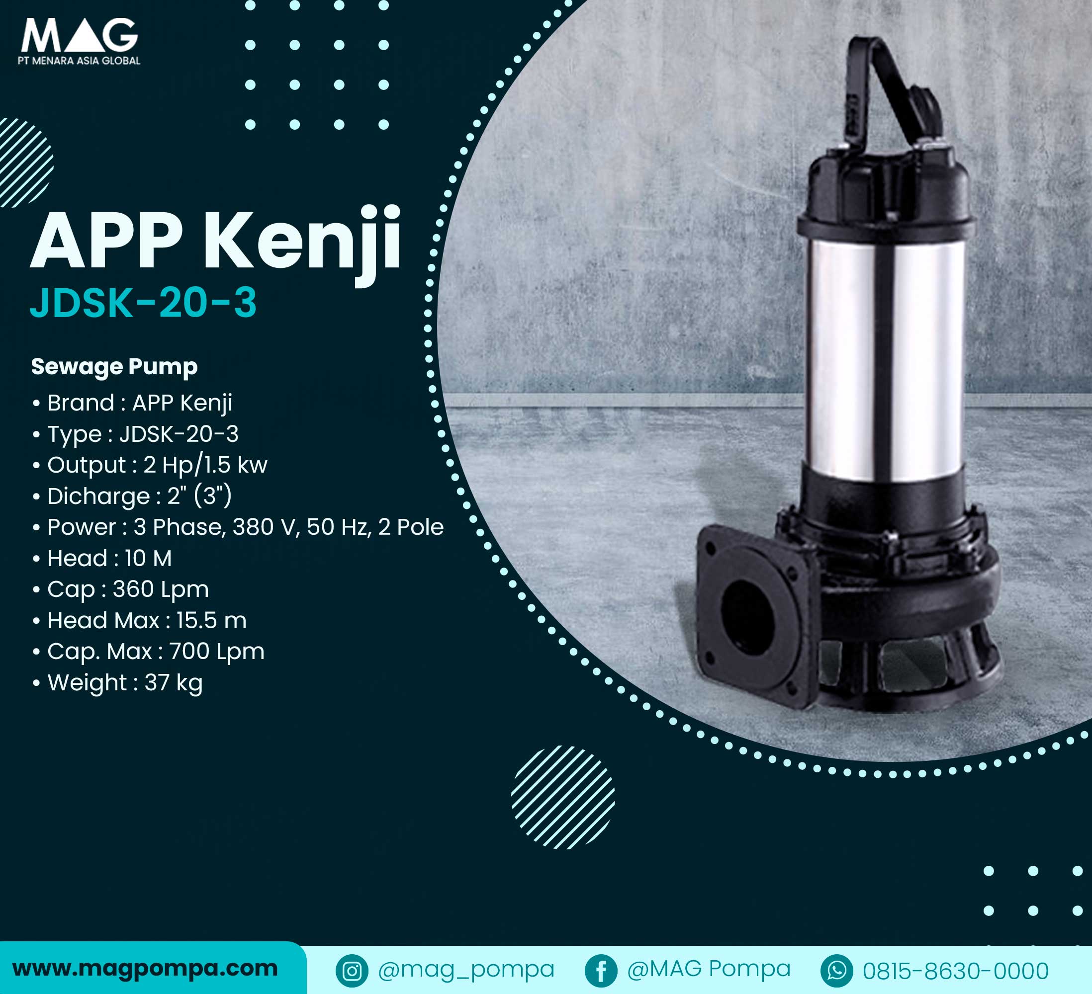 Pompa APP Kenji JDSK adalah pompa celup yang sangat handal untuk keperluan pompa air limbah, dilengkapi dengan impeler berpisau untuk memotong/menghancurkan limbah padat, mata pisau dirancang khusus yang mampu memotong limbah padat sehingga dapat menghindari penyumbatan pada saluran pipa ataupun pada pompa.