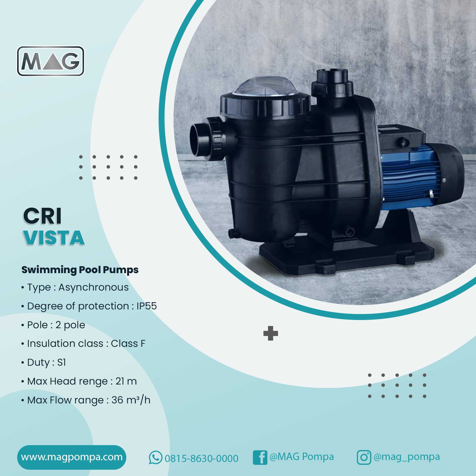 Pompa kolam renang seri “Vista” adalah tipe self-priming inbuilt dengan keranjang pra filter untuk membersihkan air kolam. Pompa kolam renang C.R.I dikembangkan dengan kombinasi pengalaman yang luar biasa, teknologi mutakhir dan sistem kontrol kualitas terintegrasi yang memenuhi standar yang diterima secara internasional.