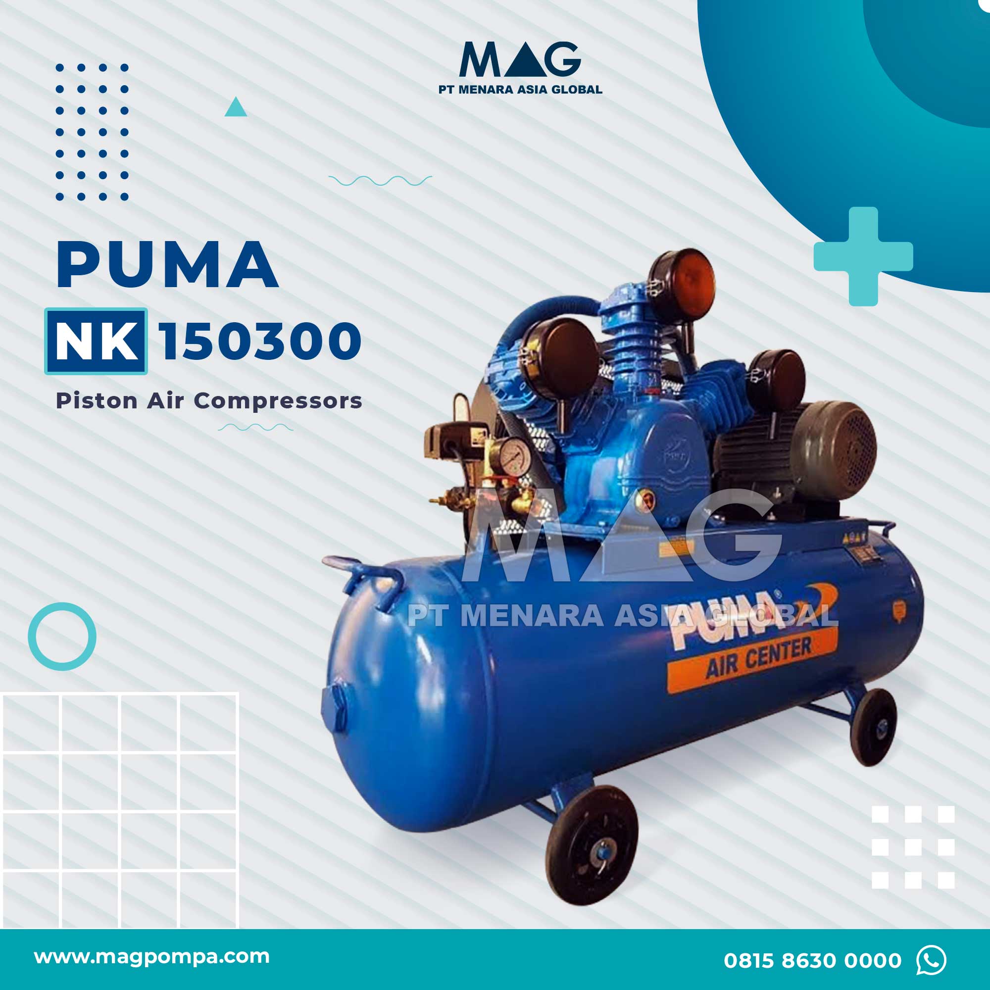 Puma NK-150-300 adalah kompressor angin yang memiliki daya 15Hp dan maksimum pressure 8 Bar, kompressor ini memiliki kemampuan pengisian angin dengan kecepatan 2198 Liter dalam satu menit yang menjamin dapat mengisi angin dengan lebih cepat. Cocok untuk digunakan pada pabrik-pabrik, sistem otomatis, layanan otomatis, finishing dan setiap pekerjaan yang membutuhkan udara terkompresi.