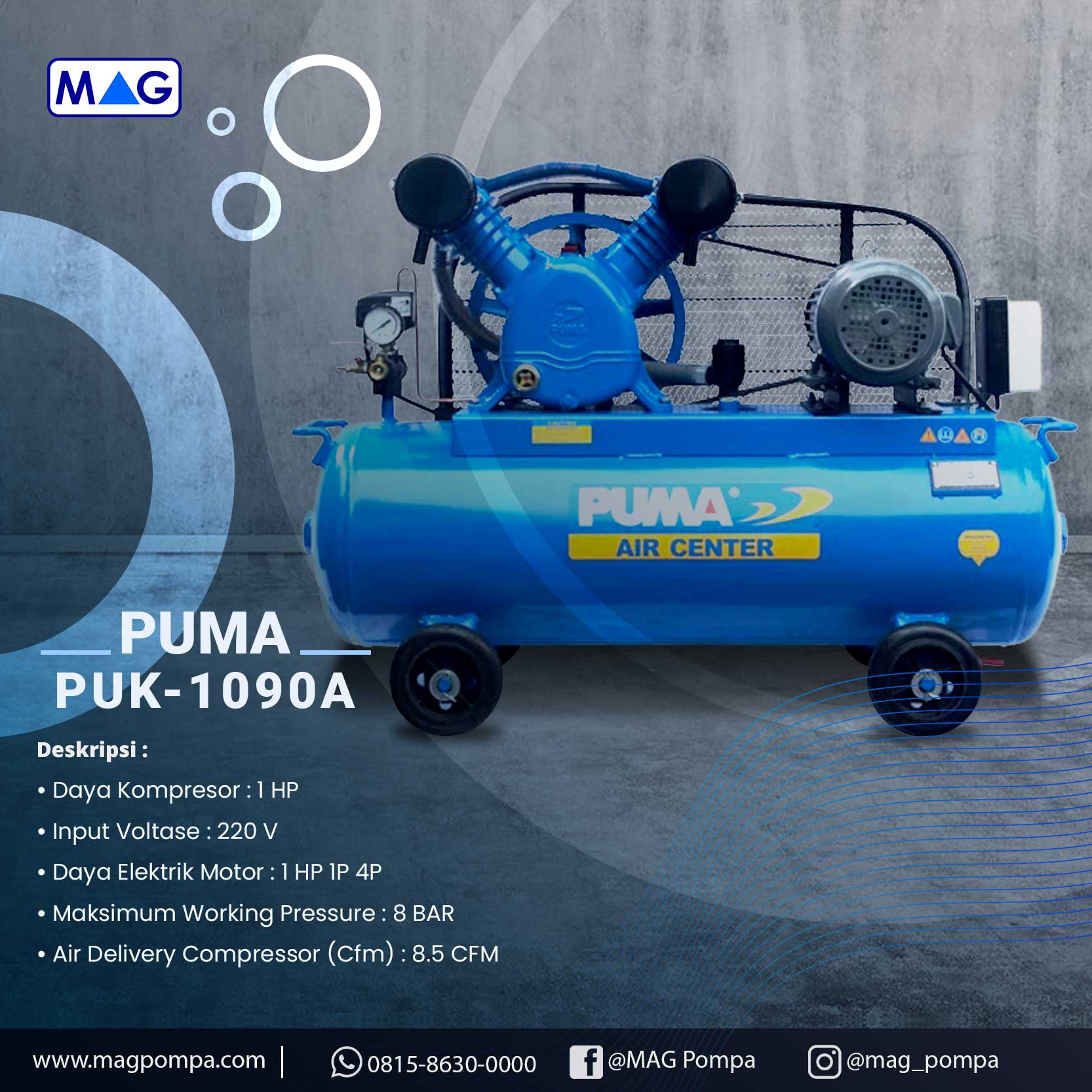 PUMA PUK-1090A merupakan kompressor angin dengan desain badan katup single, dapat meningkatkan efisiensi kompresi dan membuat perawatannya menjadi sangat mudah. Dengan bahan besi cor yang paling unggul, kompresor ini dirancang untuk keperluan industri, dengan kipas multi blade berguna untuk menurunkan suhu berlebih pada kompressor. Cocok untuk digunakan untuk pengisian angin ban, sistem otomatis, layanan otomatis, finishing dan setiap karya yang membutuhkan udara terkompresi.