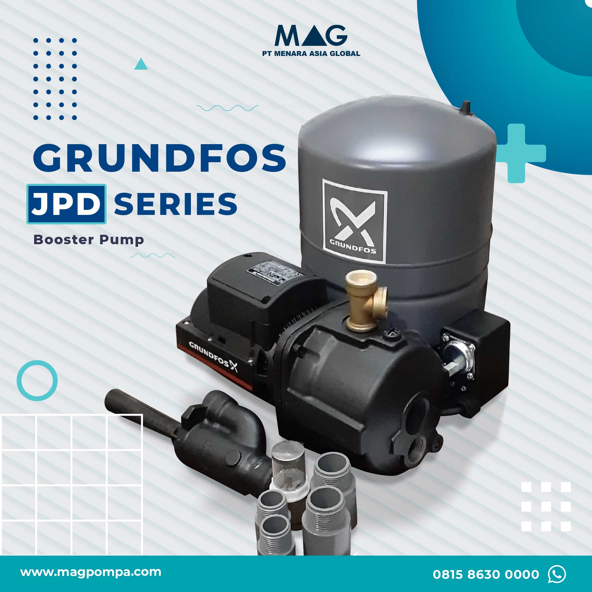 Grundfos JPD adalah pompa booster yang terdiri dari tangki tekanan dan pompa sentrifugal satu tahap self-priming, menggunakan rumah pompa berbahan besi tuang yang kokoh. JPD dirancang untuk aplikasi sumur dalam dan memiliki desain yang kuat. Pompa Booster JPD sangat andal untuk meningkatkan tekanan air pada aplikasi perumahan dan komersial. Biasanya Pompa ini digunakan untuk meningkatkan tekanan air pada bangunan yang memiliki tekanan air rendah, terutama yang memiliki banyak lantai.