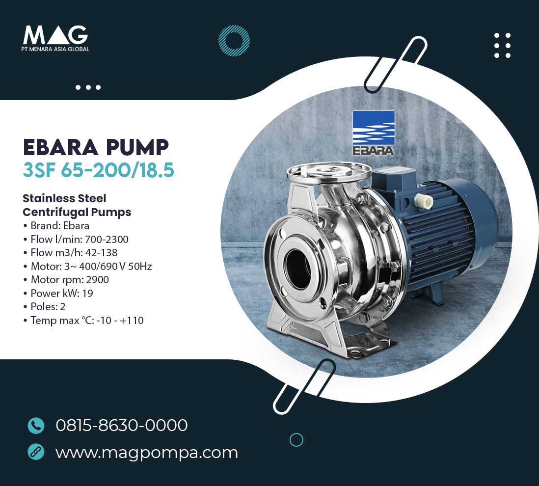 Ebara 3SF merupakan pompa sentrifugal dengan konstruksi stainless steel AISI 304 (Seri 3) dan AISI 316L (Seri 3L). Memiliki konstruksi yang sangat kuat, dan proses Hydroforming, cocok untuk memompa pasokan air, pertanian dan industri, penambah tekanan, pemadam kebakaran, sistem pemanas dan AC, cairan industri yang bergerak, irigasi, menara pendingin, kolam renang, pengosongan/pengurasan, pabrik cuci.
