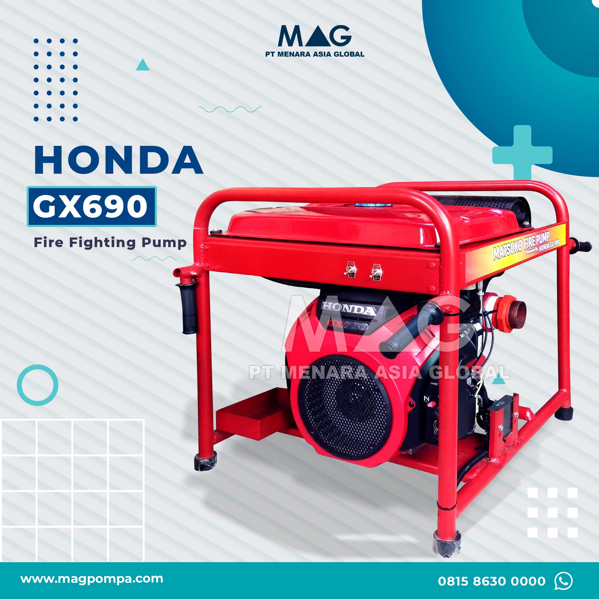 Honda GX690 merupakan mesin pompa yang sangat efisien untuk pemadam kebakaran, mampu mengalirkan air dalam jumlah besar ke lokasi kebakaran yang sulit dijangkau dengan cepat karena desain portable-nya. Mesin Honda GX690 berbahan bakar bensin yang memiliki tenaga 22 HP (16,4 kW) dan dilengkapi dengan sistem starter listrik dan pull starter sebagai cadangan. Pompa ini memiliki kapasitas output maksimum 500Gpm dan dapat mengalirkan air hingga ketinggian 90 meter. Pompa pemadam Honda GX690 ini memiliki keunggulan dalam hal portabilitas, efisiensi bahan bakar, dan kemampuan menangani situasi darurat yang berbeda.