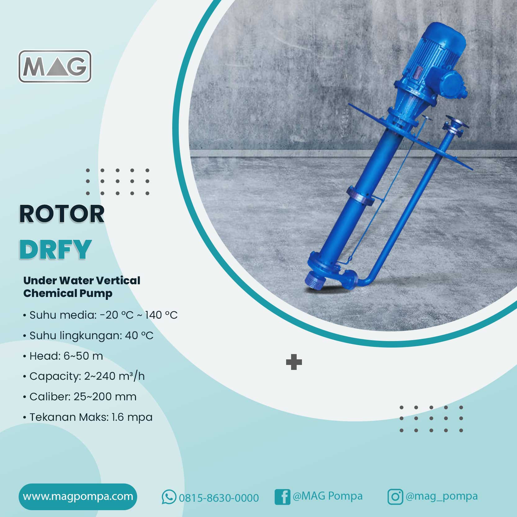 Pompa sentrifugal seri DRFY adalah jenis pompa bawah air vertikal single stage, dirancang dan diproduksi dengan teknologi yang dikembangkan di luar negeri. pompa DRFY berjalan menggunakan mechanical seal, sehingga tidak akan terjadi masalah karena mechanical seal seperti pompa pada umumnya dan dapat meminimalisir masalah perawatan. Memiliki banyak keunggulan, seperti bebas dari kebocoran, penggunaan yang tahan lama, menghemat biaya, meningkatkan efisiensi pekerjaan dan sebagainya.