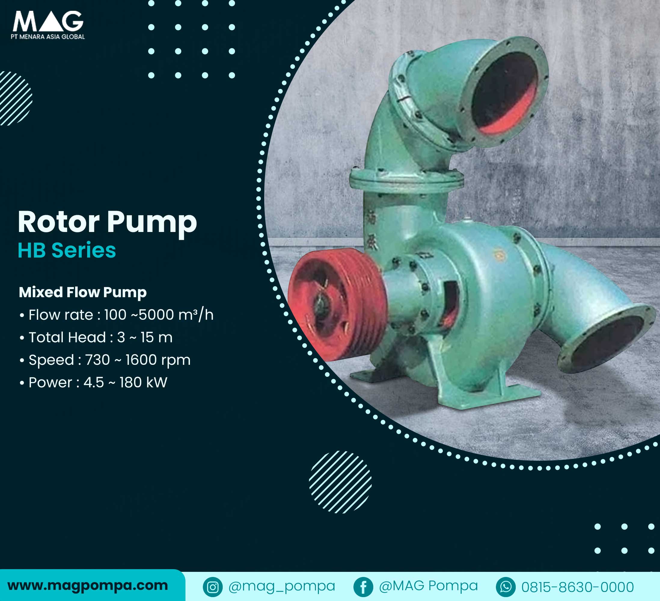 Mixed flow pump tipe HB adalah pompa volute tipe horizontal, satu tahap, hisap tunggal, tipe over-hung. Pompa ini cocok untuk irigasi dan drainase pertanian atau suplai, drainase air industri maupun sebagai pompa banjir di perkotaan.