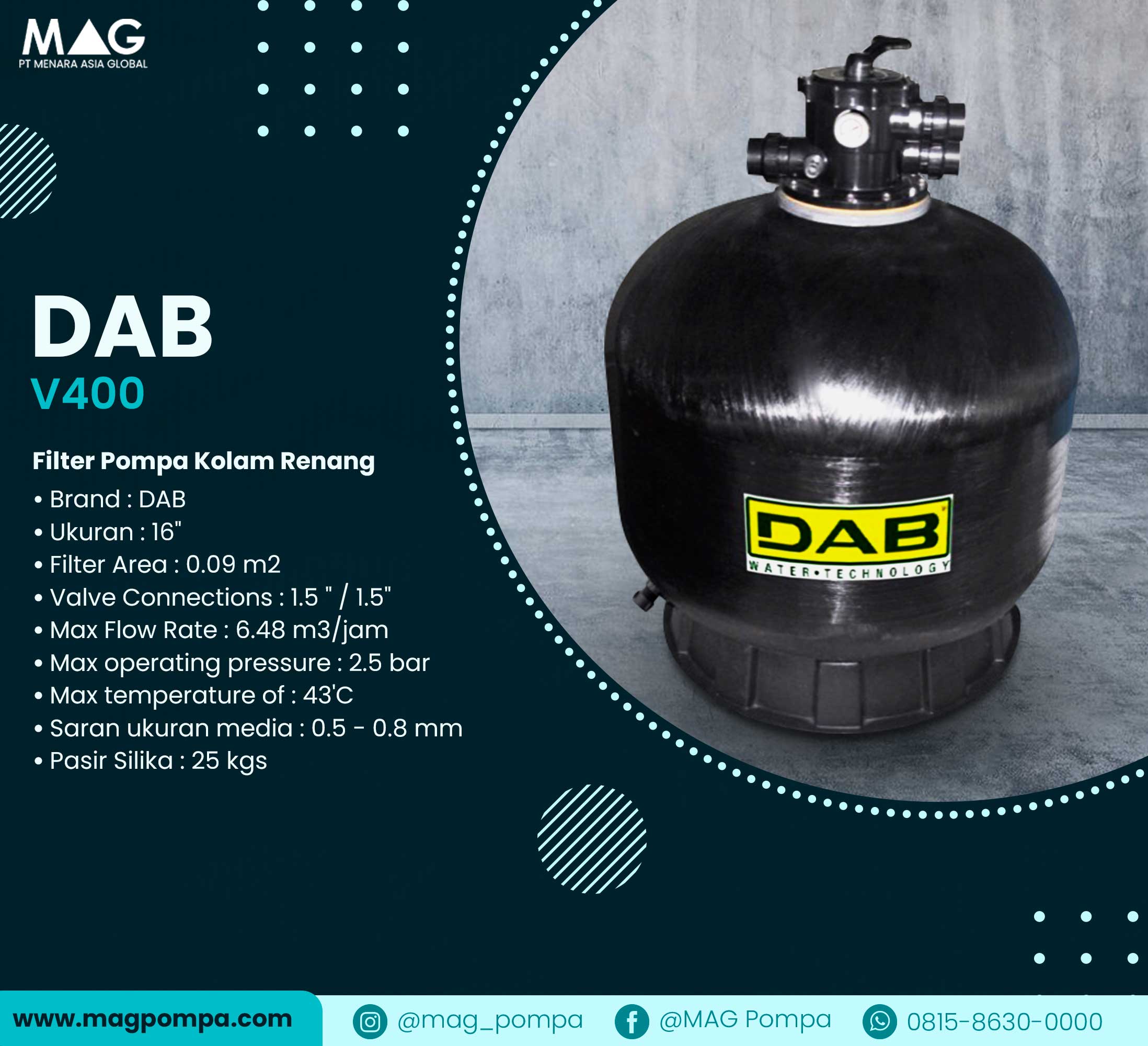 Sand Filter DAB merupakan filter air yang umumnya digunakan pada kolam renang, khususnya dipasangkan dengan pompa kolam renang DAB EUROSWIM. Terbuat dari fiberglass berkualitas tinggi sehingga Sand filter DAB kokoh dan memiliki daya tahan yang sangat baik serta sangat mudah dalam perawatanya. Selain sangat cocok digunakan pada filterasi air pada kebutuhan rumah tangga, dapat juga di gunakan pada filterasi komersial ataupun industri.