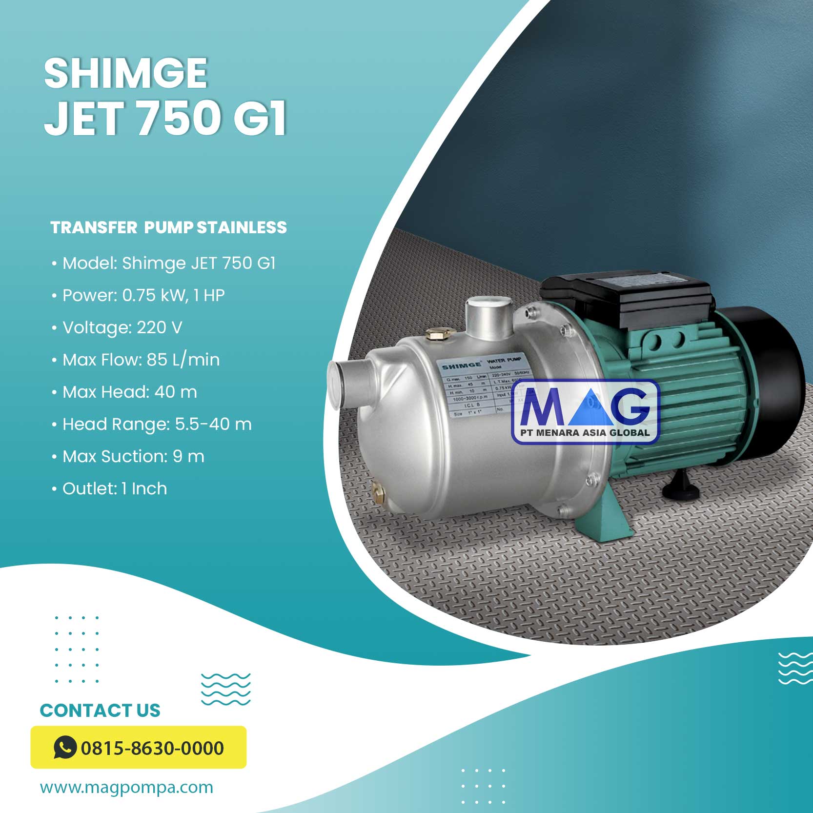Jet Pump Shimge JET-G1 adalah pompa self priming yang memiliki sistem Jet Otomatis. Pompa yang serbaguna dan dapat digunakan untuk irigasi pertamanan, pemompaan air sumur, dll. Pompa pemancing otomatis ini cocok untuk mengekstraksi air bersih dan cairan kimia non-korosif. Kinerjanya dapat diandalkan dan aman, serta mudah dalam pengoperasiannya.