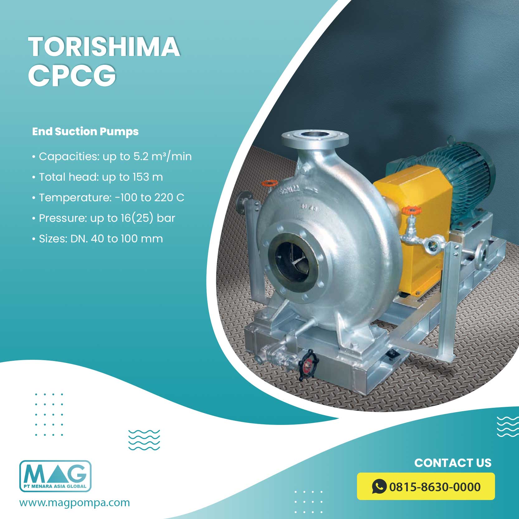 Torishima CPC adalah pompa yang telah dikembangkan sesuai ISO2858/DIN24256, khususnya untuk memenuhi kebutuhan berbagai utilitas industri serta untuk menangani produk yang digunakan dalam proses semi organik dan Pompa Torishima CPC juga sangat handal diaplikasikan sebagai pompa pemadam kebakaran karena janis pompa ini memiliki tekanan pengiriman yang lebih tinggi daripada pompa end suction pada umumnya.