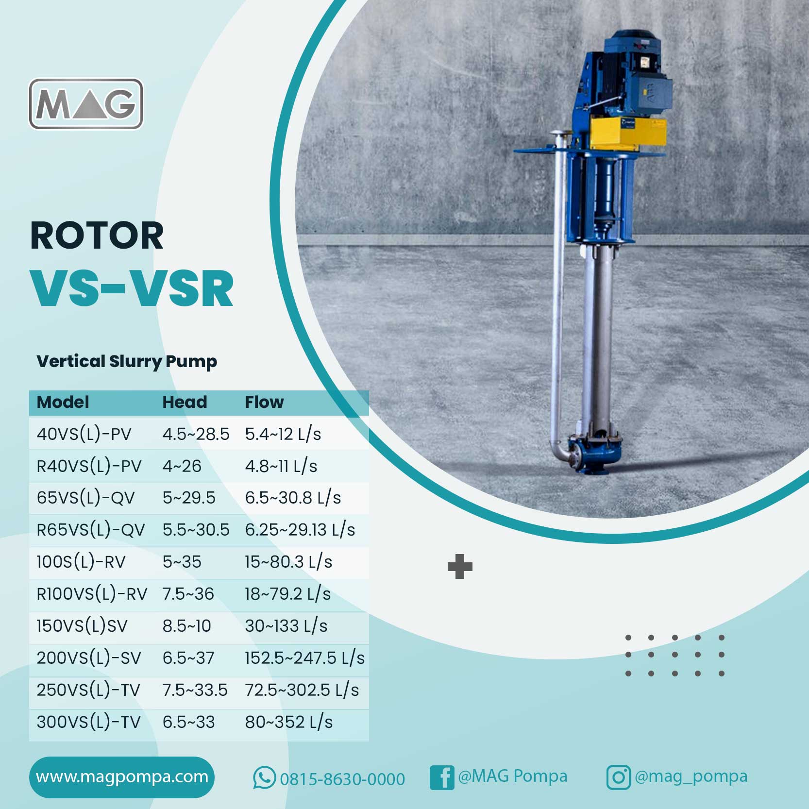 Rotor VS-VSR merupakan pompa lumpur sentrifugal vertikal yang beroperasi terendam di dalam bah. Dirancang untuk memompa lumpur yang abrasif, partikel besar, dan kebutuhan yang tinggi. Pompa ini membutuhkan shaft seal dan sealing water. Mereka juga dapat bekerja dengan normal pada kondisi suction yang tidak mencukupi. Bagian basah dari pompa tipe VS terbuat dari logam tahan abrasi. semua bagian pompa VSR yang terendam dalam cairan dilapisi dengan lapisan luar karet. Mereka cocok untuk mengangkut lumpur abrasif.